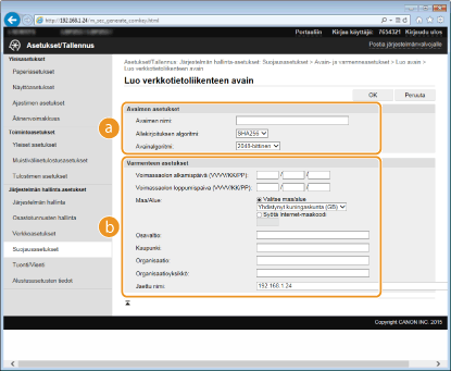 Syötä enintään 24 aakkosnumeerista merkkiä avainparin nimeksi. Aseta nimi, joka sinun on helppo löytää myöhemmin luettelosta.