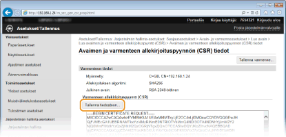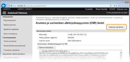 Varmenteen allekirjoituspyynnöllä (CSR) luotua avainparia ei voi käyttää, ennen kuin varmenne on tallennettu. Kun varmenteen myöntäjä on myöntänyt digitaalisen varmenteen, tallenna se alla kuvatuin toimenpitein.