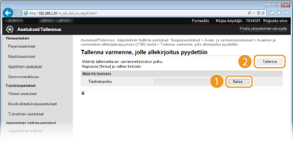Napsauta [Selaa], määritä varmenteen allekirjoituspyynnön tiedosto ja napsauta [Tallenna].