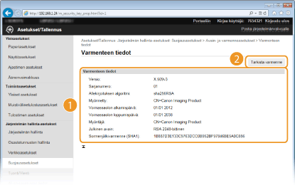Kun avainparit ja CA-varmenteet on rekisteröity, voit näyttää niiden tarkat tiedot tai varmistaa niiden voimassaolon ja allekirjoituksen.