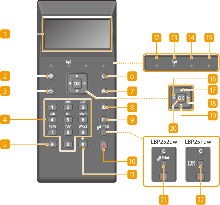 Visar aktuell status för utskriften eller annan funktion, felinformation, återstående tonernivå i tonerpatronen osv.