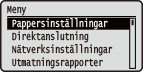 visas skärmen <Meny>. På den här skärmen kan du ange allmänna enhetsinställningar som <Preferenser> eller <Timerinställningar>, men även många inställningar för respektive funktion, till exempel pappersinställningar och täthetsjustering.