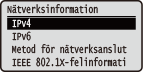 Visar nätverksinställningar, som enhetens IP-adress och status, som den trådlösa nätverkskommunikationens kondition.