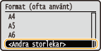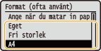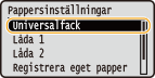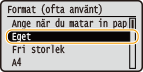 När du har registrerat standardpappersinställningar visas inte inställningsskärmen när du fyller på papper utan samma inställningar används varje gång. Om du fyller på andra pappersformat eller papperstyper utan att ändra pappersinställningar blir utskrifterna kanske inte bra. För att undvika detta problem väljer du <Ange när du matar in papper> i steg 3 och fyller därefter på papperet.