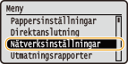 Alla inställningar för nätverket visas med korta beskrivningar. Standardinställningarna markeras med ett kors (