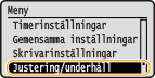 Alla inställningar för justering och underhåll visas med korta beskrivningar. Standardinställningarna markeras med ett kors (