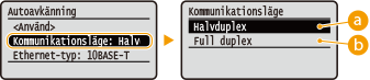 Välj <Halvduplex> eller <Full duplex> ![]() ![]() <Halvduplex>Sänder och tar emot kommunikationsdata alternerande. Välj det här alternativet om enheten är ansluten till en nätverksenhet med halv duplex.
