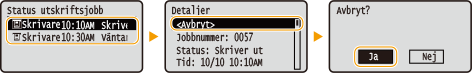 Avbryta från gränssnittet för fjärranvändningDu kan avbryta utskriften från sidan [Jobbstatus] i Fjärranvändargränssnittet: Kontrollera aktuell status för utskriftsdokument