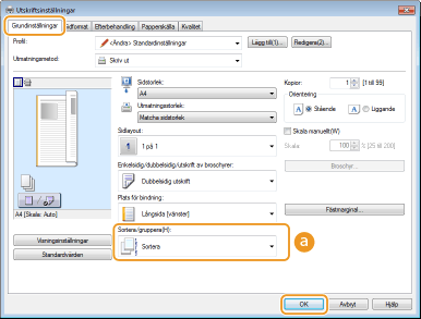 Ange sorteringssätt för utskrifterna vid utskrift av flersidiga dokument.