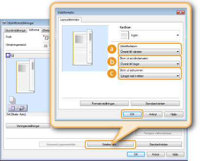 Välj utskriftsposition för utskriftsdatum, användarnamn och sidnummer