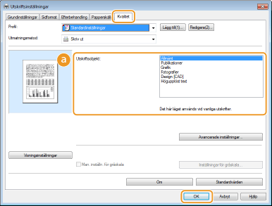 Välj ett alternativ som passar dokumenttypen eller ändamålet med utskriften. Du kan till exempel välja [Allmänt] för normalt bruk eller [Fotografier] du vill skriva ut fotografier med optimal kvalitet.