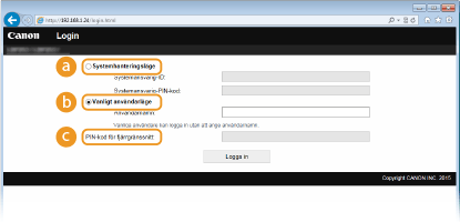 Du har tillgång till alla åtgärder och inställningar i Fjärranvändargränssnittet. Ange lämpligt ID i [Systemansvarig-ID] och PIN-kod i [Systemansvarig-PIN-kod] (