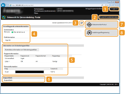 Visar den supportlänk som angetts i [Enhetsinformation] under [Systemhantering].
