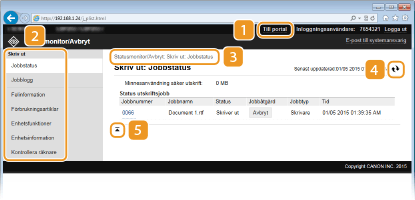 Visar [Statusmonitor/Avbryt]-sidan. På den här sidan kan du kontrollera utskriftsstatus, avbryta utskriftsbearbetning och se utskriftshistorik.
