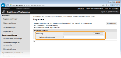 Läs in (importera) data som exporterats från enheten. Du kan även importera inställningar från en annan enhet om det är samma modell som din enhet.