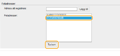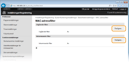 Om MAC-adresser anges felaktigt kanske du inte kan använda enheten från Fjärranvändargränssnittet och då måste du ställa in <MAC-adressfilter> på <Av>. MAC-adressfilter