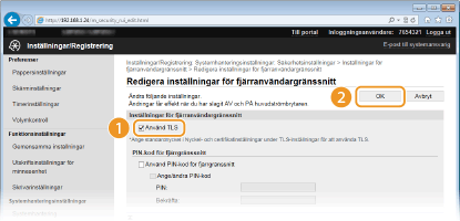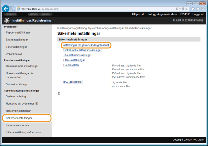 Klicka på [Säkerhetsinställningar]  [Inställningar för fjärranvändargränssnitt].