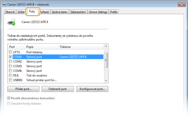 Na kartě [Porty] zkontrolujte, že je vybrán správný port.