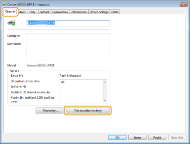 Na kartě [General] (Obecné) klikněte na položku [Print Test Page] (Tisk zkušební stránky).