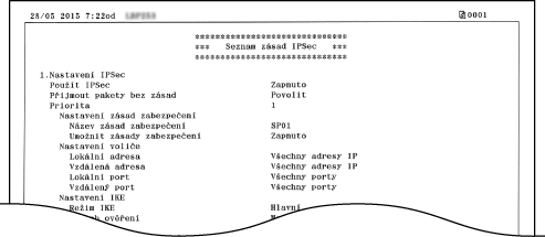 Pokud vytisknete seznam zásad zabezpečení IPSec, můžete zkontrolovat seznam názvů zásad a nastavení IPSec uložené v zařízení.