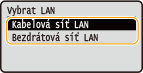 Vyberte možnost <Kabelová síť LAN> nebo <Bezdrátová síť LAN> a stiskněte tlačítko