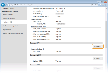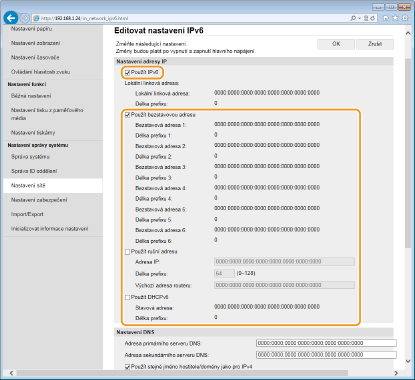 Adresy IPv6 zařízení lze nakonfigurovat pomocí Vzdáleného uživatelského rozhraní. Před nastavením adres IPv6 zkontrolujte nastavení adresy IPv4 (Zobrazení nastavení IPv4). Chcete-li používat adresy IPv6, je třeba správně nastavit adresu IPv4. Zařízení může používat až devět z následujících adres IPv6:
