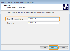 Zadejte IP adresu nebo název DNS zařízení a klikněte na tlačítko [Další].