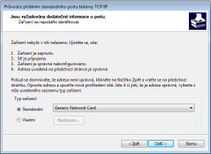 ![]() ![]() Když se objeví další obrazovka, řiďte se pokyny, které jsou na ní uvedeny. ![]() * Když vyberete [Typ zařízení], vyberte možnost [Síťové zařízení Canon pro tisk s P9100] v nabídce [Standardní].