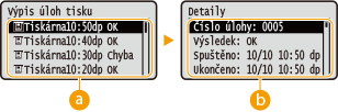 .![]() <Výpis úloh tisku>Zobrazí seznam vytištěných dokumentů. <Pokud byl dokument vytištěn úspěšně, zobrazí se zpráva <OK>, pokud se dokument nepodařilo vytisknout, protože byl zrušen nebo došlo k chybě, zobrazí se zpráva <Chyba>.