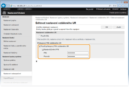 Zaškrtněte políčko [Použít přístupový PIN vzdáleného UR] a nastavte kód PIN.