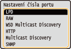 Porty slouží jako koncové body pro komunikaci s ostatními zařízeními. Pro hlavní protokoly jsou typicky použita běžná čísla portů. Vzhledem k tomu, že tato čísla portů jsou dobře známa, jsou zařízení s těmito čísly portů zranitelná vůči útokům. Váš správce sítě může změnit čísla portů za účelem zvýšení zabezpečení zařízení. Po změně čísla portu musí být pro nové číslo nastaveno sdílení s komunikujícími zařízeními, jakými jsou počítače a servery. V závislosti na síťovém prostředí zadejte nastavení čísla portu.
