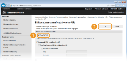 Komunikaci mezi zařízením a webovým prohlížečem v počítači je možné šifrovat pomocí funkce TLS (Transport Layer Security). Protokol TLS je mechanismus šifrování dat odeslaných nebo přijatých prostřednictvím sítě. Pokud je nastavení IPSec (Metoda předsdíleného klíče), ověřování IEEE 802.1X (TTLS/PEAP) nebo protokolu SNMPv3 zadáváno přes Vzdálené uživatelské rozhraní, musí být povolen protokol TLS. Chcete-li použít funkci TLS pro Vzdálené uživatelské rozhraní, je třeba nastavit pár klíčů a povolit funkci TLS. Před povolením funkce TLS je třeba vygenerovat nebo nainstalovat pár klíčů pro protokol TLS (