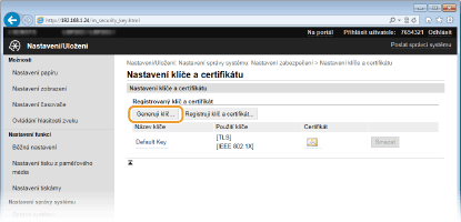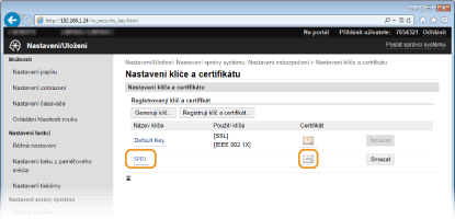 Pokud je pár klíčů z nějakého důvodu aktuálně používán, např. pokud se pod položkou [Použití klíče] zobrazuje informace „TLS“ nebo „IEEE 802.1X“, pak tento pár klíčů nelze smazat. V takovém případě je před smazáním nutné příslušnou funkci zakázat nebo vyměnit.
