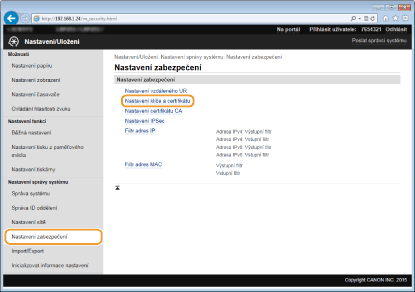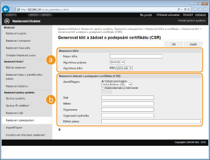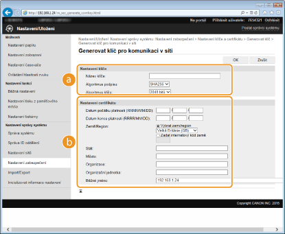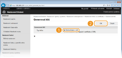 Pokud šifrovaná komunikace probíhající prostřednictvím protokolu TLS (Transport Layer Security) vyžaduje pár klíčů, je možné ho pomocí zařízení vygenerovat. Protokol TLS lze použít při přístupu k zařízení prostřednictvím Vzdáleného uživatelského rozhraní. Pro zařízení je možné registrovat až pět párů klíčů, včetně předinstalovaných párů. Certifikáty podepsané svým držitelem jsou používány s páry klíčů vygenerovanými pomocí možnosti „Komunikace v síti“. Pomocí možnosti „Klíč a žádost o podepsání certifikátu (CSR)“ můžete požádat o digitální certifikát od certifikační autority pro pár klíčů vygenerovaný zařízením.