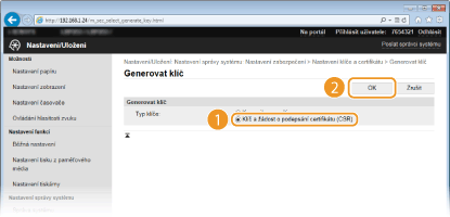 Vyberte možnost [Klíč a žádost o podepsání certifikátu (CSR)] a klikněte na tlačítko [OK].