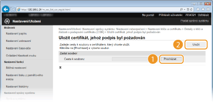Klikněte na tlačítko [Browse] (Procházet), zadejte soubor, pro který chcete žádat o podepsání certifikátu (CSR), a klikněte na tlačítko [Uložit].