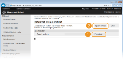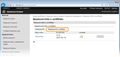 Kliknutím na možnost [Nastavení klíče a certifikátu] nainstalujte pár klíčů. Kliknutím na možnost [Nastavení certifikátu CA] nainstalujte certifikát CA.