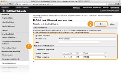 Bejegyezheti a készülék nevét és telepítési helyét, amelyet a készülék azonosítására használhat, valamint más hasonló információkat. A készüléken le is tilthatja az AirPrint funkciót. Ezeket a beállításokat a Távoli felhasználói felületen módosíthatja.