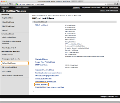 Az AirPrint beállításainak megváltoztatásához jelentkezzen be rendszerkezelői módban.