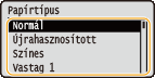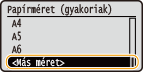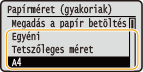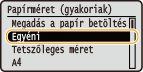 Az alapértelmezett papírbeállítás bejegyzése után a papírok behelyezésekor nem jelenik meg a papírbeállító képernyő, és a készülék mindig ugyanazt a beállítást alkalmazza. Ha a papírbeállítások módosítása nélkül helyez be más méretű vagy típusú papírt, akkor előfordulhat, hogy a készülék nem megfelelően fog nyomtatni. A probléma elkerülése érdekében válassza a <Megadás a papír betöltésekor> lehetőséget a 3. lépésben, majd helyezze be a papírt.