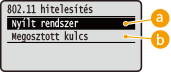 Ha a készülék vezeték nélküli hálózathoz csatlakozik, és a vezeték nélküli útválasztón megosztott kulcsos hitelesítés van beállítva, akkor a készülék hitelesítési hibát észlel. Ilyenkor a készülék automatikusan a <Megosztott kulcs> beállításra vált, és ismét megpróbálkozik a csatlakozással.