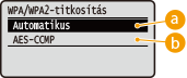 gombot.![]() <Automatikus>Úgy állítja be a készüléket, hogy az a vezeték nélküli útválasztó beállításának megfelelően automatikusan választ az AES-CCMP és a TKIP mód közül.