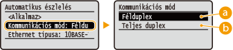 Válassza ki a <Félduplex> vagy a <Teljes duplex> lehetőséget ![]() ![]() <Félduplex>Felváltva küldi és fogadja a kommunikációs adatokat. Akkor válassza, ha a készülék félduplex módon kommunikáló hálózati eszközhöz van csatlakoztatva.