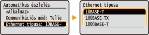 Válassza ki az Ethernet típusát ![]() ![]() ![]() Ha a <Kommunikációs mód> értéke <Félduplex>, nem választhatja az <1000BASE-T> lehetőséget.