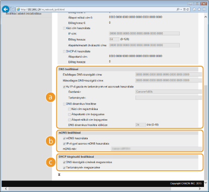 Ha bejelöli a jelölőnégyzetet, akkor a készülék dinamikusan frissíti a DNS-rekordokat, amikor megváltozik az IP-címe. A [Kézi cím regisztrálása], [Állapottartó cím bejegyzése] és [Állapot nélküli cím bejegyzése] jelölőnégyzetek közül a megfelelők bejelölésével adja meg a DNS-kiszolgálón bejegyezni kívánt címtípusokat. A frissítések időközének megadásához írjon be egy időtartamot órákban a [DNS dinamikus frissítési időköze] szövegmezőbe. [mDNS beállításai][mDNS használata]