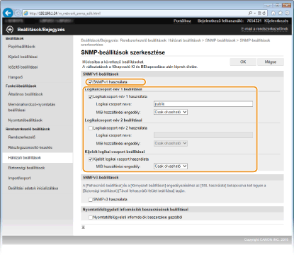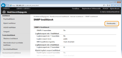Az SNMP beállításokat a kezelőpanel  gombjával engedélyezheti vagy tilthatja le. SNMP-beállítások