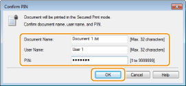 Adja meg a [Document Name] (Dokumentumnév), [User Name] (Felhasználónév) és [PIN] értékét, majd kattintson az [OK] gombra.