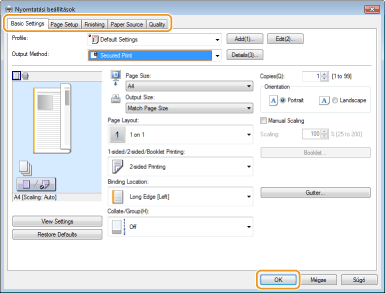 Kattintson az [Basic Settings] (Alapbeállítások), [Page Setup] (Oldalbeállítás), [Finishing] (Befejező művelet), [Paper Source] (Papírforrás), vagy [Quality] (Minőség) fülekre, és adja meg mindegyik képernyőn igény szerint a nyomtatási beállításokat.