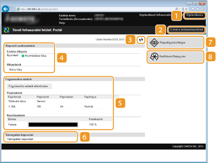 Megjeleníti a készülék aktuális állapotát és a hibainformációkat. Ha hiba történt, akkor megjelenik a Hibainformációk oldalra mutató hivatkozás.