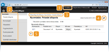 Megjeleníti az [Állapotfigyelés/Mégse] lapot. Ezen a lapon ellenőrizheti a nyomtatás állapotát, törölheti a nyomtatást, és megtekintheti a korábbi nyomtatási feladatokat.